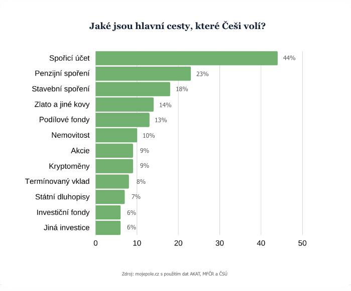 Češi jsou, co se týče investic, velmi konzervativní. Nejčastěji si peníze spíše spoří, ukládají je na běžných účtech, případně v podobě různých spoření.